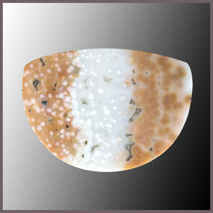 Ocean Jasper® polished cabochon featuring white, pale yellow, a little bit of green, and orange jasper with orbicular patterning in white.