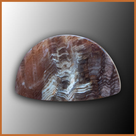 Petrified Wood polished cabochon featuring patterning in shades of browns and white.