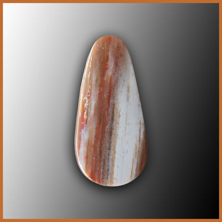 Petrified Wood polished cabochon featuring patterning in light brown and gray with red-orange.
