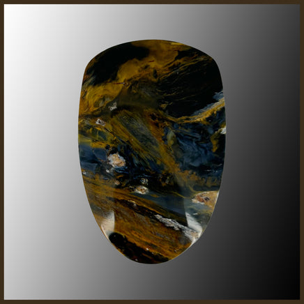 Pietersite polished cabochon featuring brown, orange, black, and blue shimmering chatoyant Pietersite.