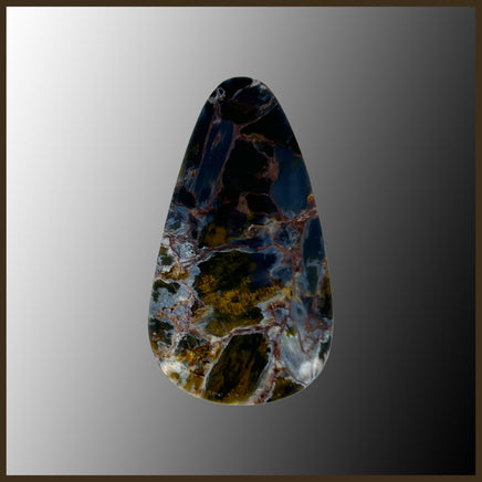 Pietersite polished cabochon featuring brown, orange, black, and blue shimmering chatoyant Pietersite and pink brecciated inclusions.