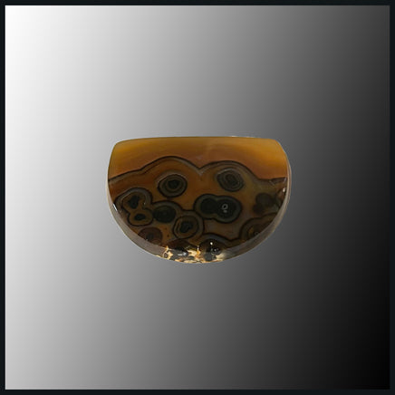 Polished orange, yellow, black, and grey piranha agate cabochon.