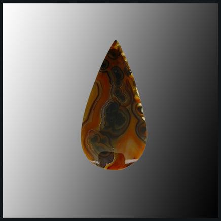 Polished orange, yellow, black, and grey Piranha Agate cabochon.