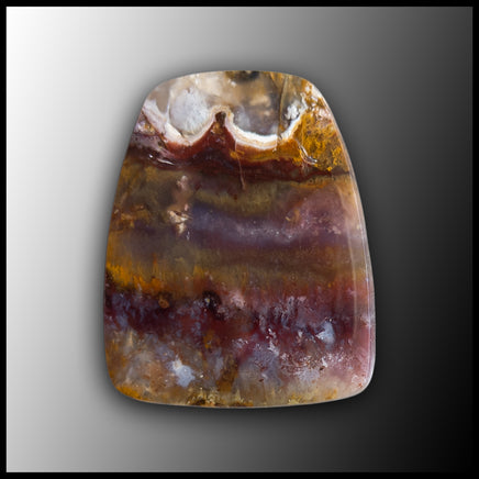 Plume Agate found in Oregon, mined by longtime miner and rockhound Jake Jacobitz. This polished cabochon features colorful plume agate with white, golden orange, red, and purple.