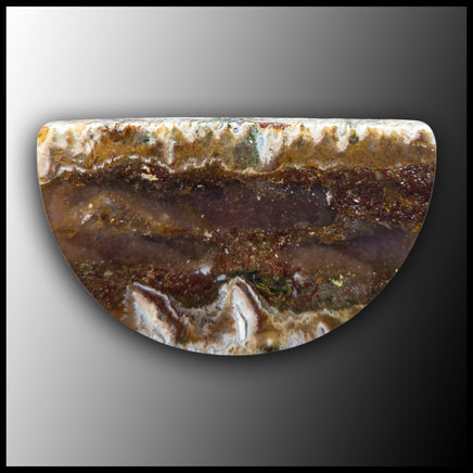Plume Agate found in Oregon, mined by longtime miner and rockhound Jake Jacobitz. This polished cabochon features colorful plume agate in red, white, golden brown, and green.