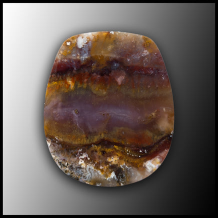 Plume Agate found in Oregon, mined by longtime miner and rockhound Jake Jacobitz. This polished cabochon features colorful plume agate in white, red, golden yellow, and purple.