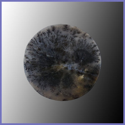Plume Agate Cabochon with black, white, and orange/brown plumes set in bluish-white agate.