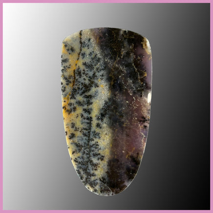 Purple Sage Agate Cabochon with black and orange plumes set inside semi-translucent purple agate on the right, and speckled grey chalcedony on the left.