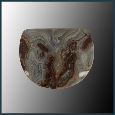 Polished red, orange, grey, light blue, and white Red Lace Agate cabochon.