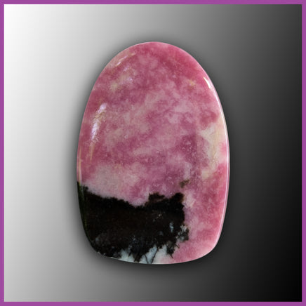 Rhodonite polished cabochon featuring shades of pink with a section of solid black.