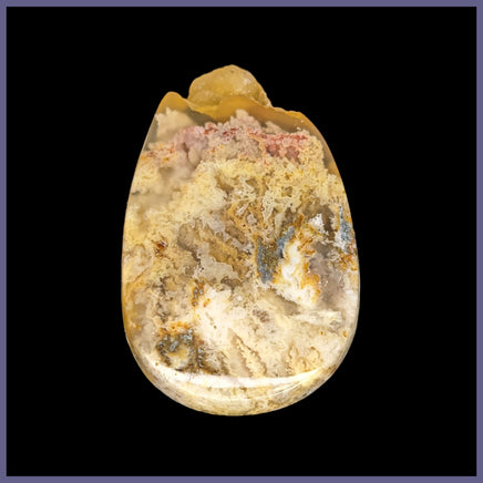 Tan, white, yellow, orange, red, and blue plumes in translucent agate with a natural edge top.