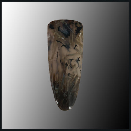Brown, black, blue, and white signature stick shapes in translucent agate.