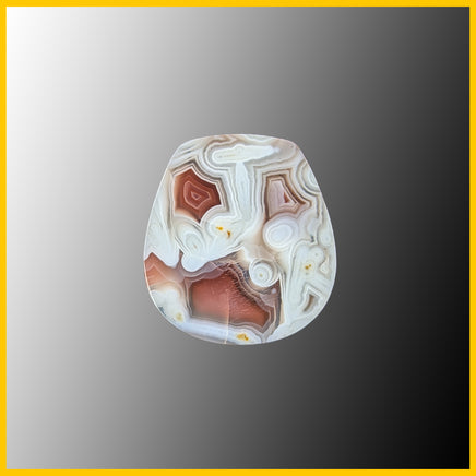 Swazi Agate Polished cabochon with white, pink, and red agate with banding and tube patterns.