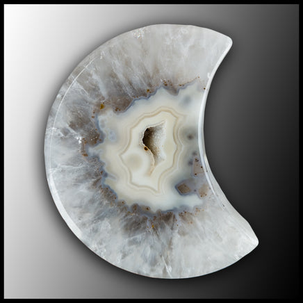 This polished moon carving features quartz with creamy agate and a sparkly druzy section.