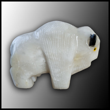 A large white Bison, or American Buffalo, carved from white onyx with Black Onyx horns and yellow or blue eyes.