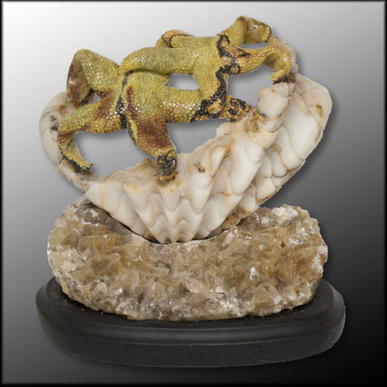 This starfish is carved out of one piece of Serpentine in Quartz and mounted on a Calcite and Black Onyx base.