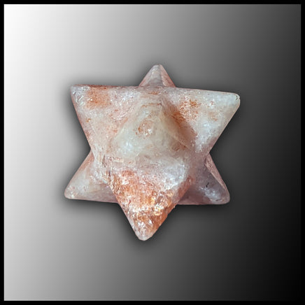 Small merkabah carved from sunstone, in creamy white with orange and red shiny patterning.