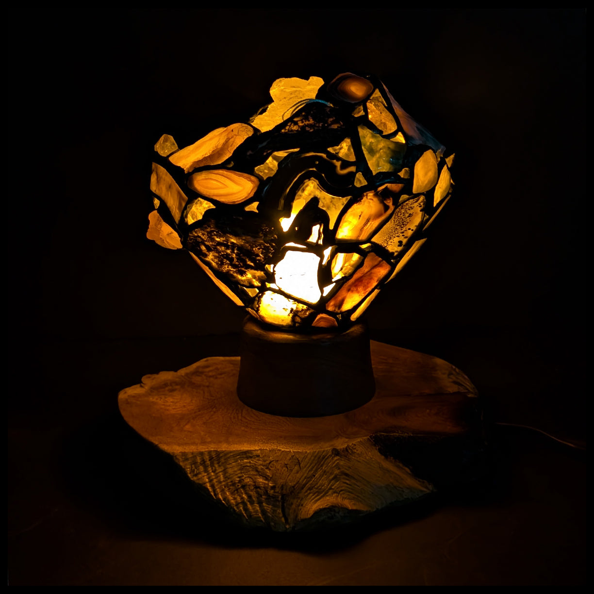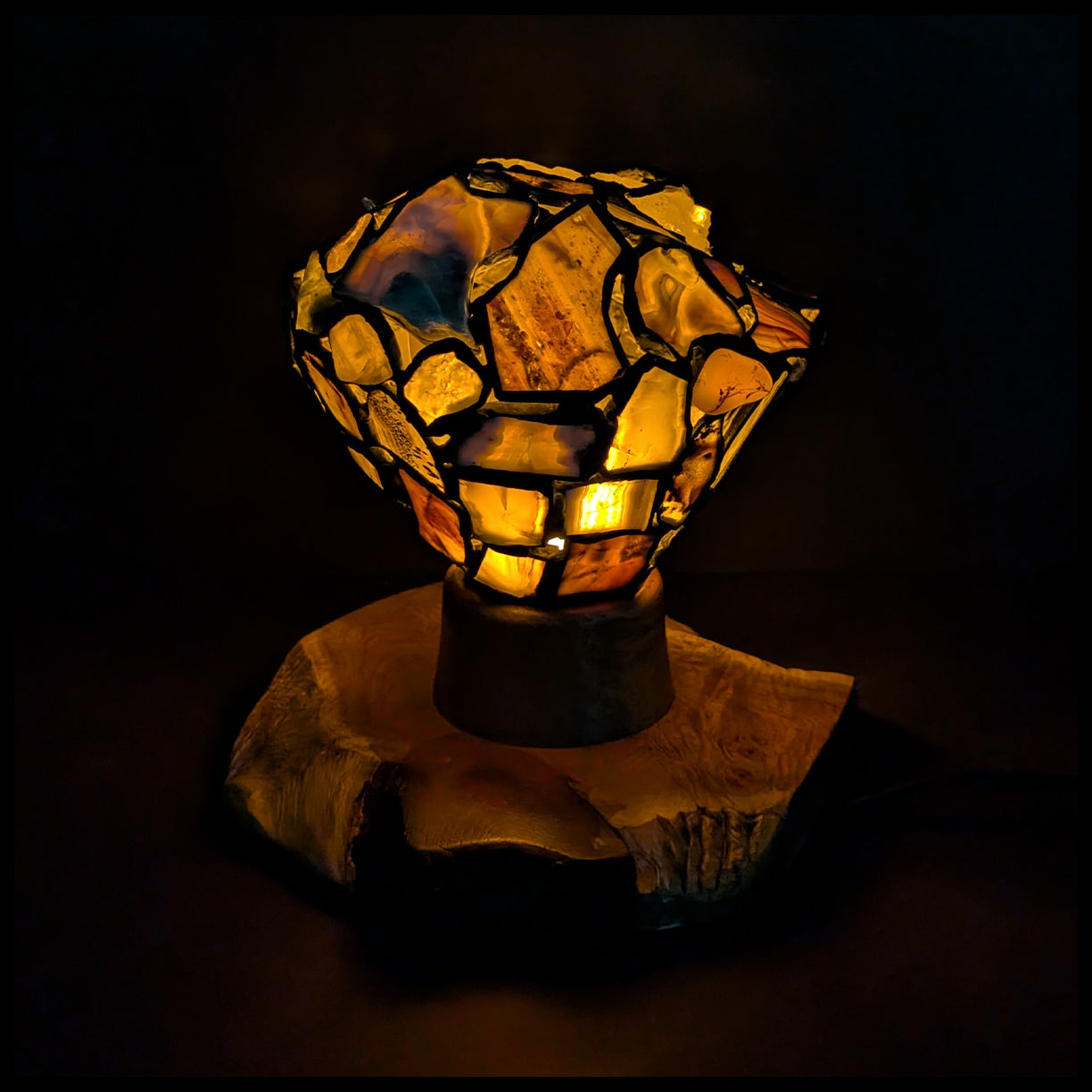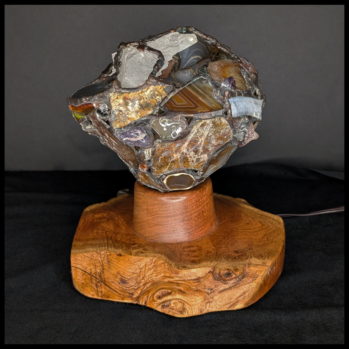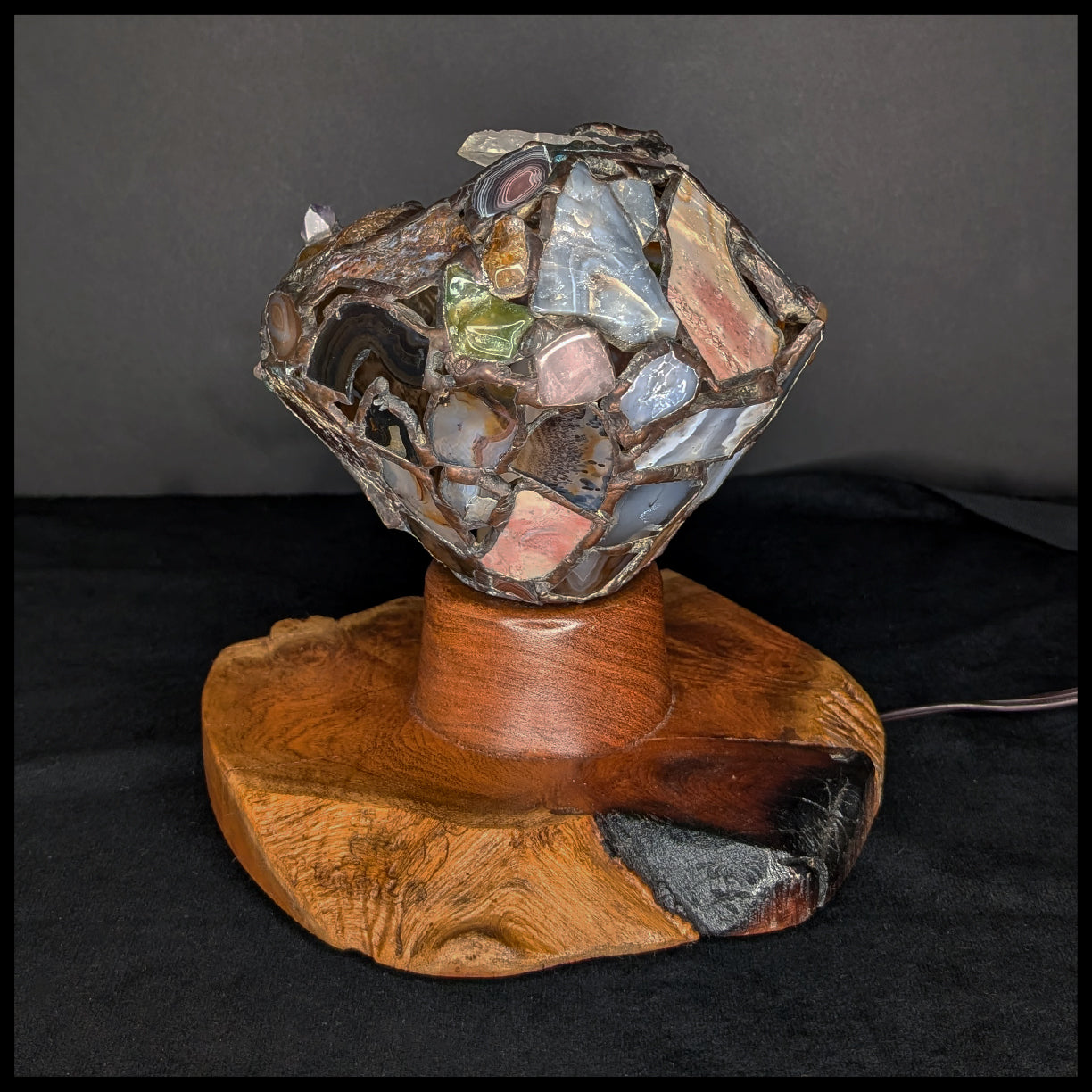 This gemstone creation is a beautiful piece of Home Decor by artist Jim Pape. It is created from a beautiful piece of Mesquite Wood, which is shaped to hold the lightbulb and cord fixture within, and allows the top mosaic of gemstones and chalcedonies to sit on top. The assortment of slabs and tumbled stones are wrapped with copper and soldered, with an antique patina finish.