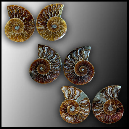 These specimens were found in Mahajanga, Madagascar, and date back to the early Cretaceous period (roughly 100 million years ago). These Ammonite fossils have been cut into pairs and polished, with natural backs. The colors range from a blonde yellow to a deep reddish brown - the picture shows an example of the range of colors the pairs display. If you have a preference on the color you receive, please describe in your order notes.