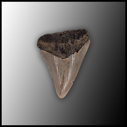 This Megalodon fossil tooth comes from the coast of South Carolina. The upper root is very dark brown and textured, with a gray/beige tooth that is smoother beneath. It has mostly intact edges with intact serration, with small chips on either side.