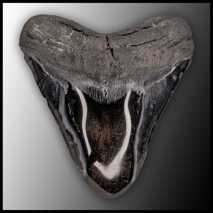 This large Megalodon fossil tooth comes from the coast of South Carolina. It has dark gray to black coloring with a polished top surface and an intact textured root. The very tip of the crown is smooth, but the edges have weathered serration.