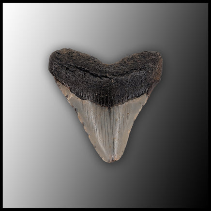 This Megalodon fossil tooth comes from the coast of South Carolina. It has grayish beige and dark brown coloring with weathered edges and root.