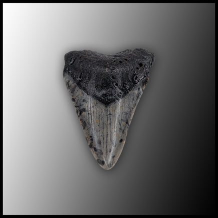 This Megalodon fossil tooth comes from the coast of South Carolina. It has medium to dark gray coloring with weathered edges and root.