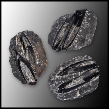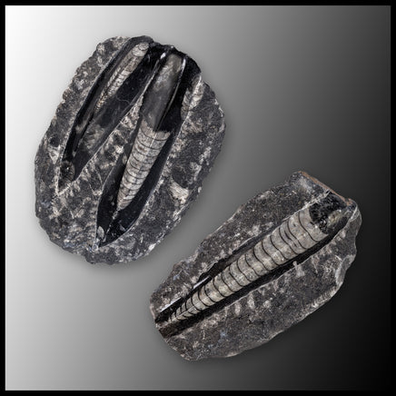 From Morocco, believed to be from the Devonian age. These pieces show the dark gray to black limestone host with an orthoceras fossil protruding out. The fossil is shaped out of the limestone and the host is chipped away to better reveal the 3-dimensional shell. The revealed section is then polished to mimic the shape of the overall cone. Pictures are representative of the fossil you will receive, but each piece is unique. Choose from a singular polished fossil in matrix or a pair revealed in matrix.