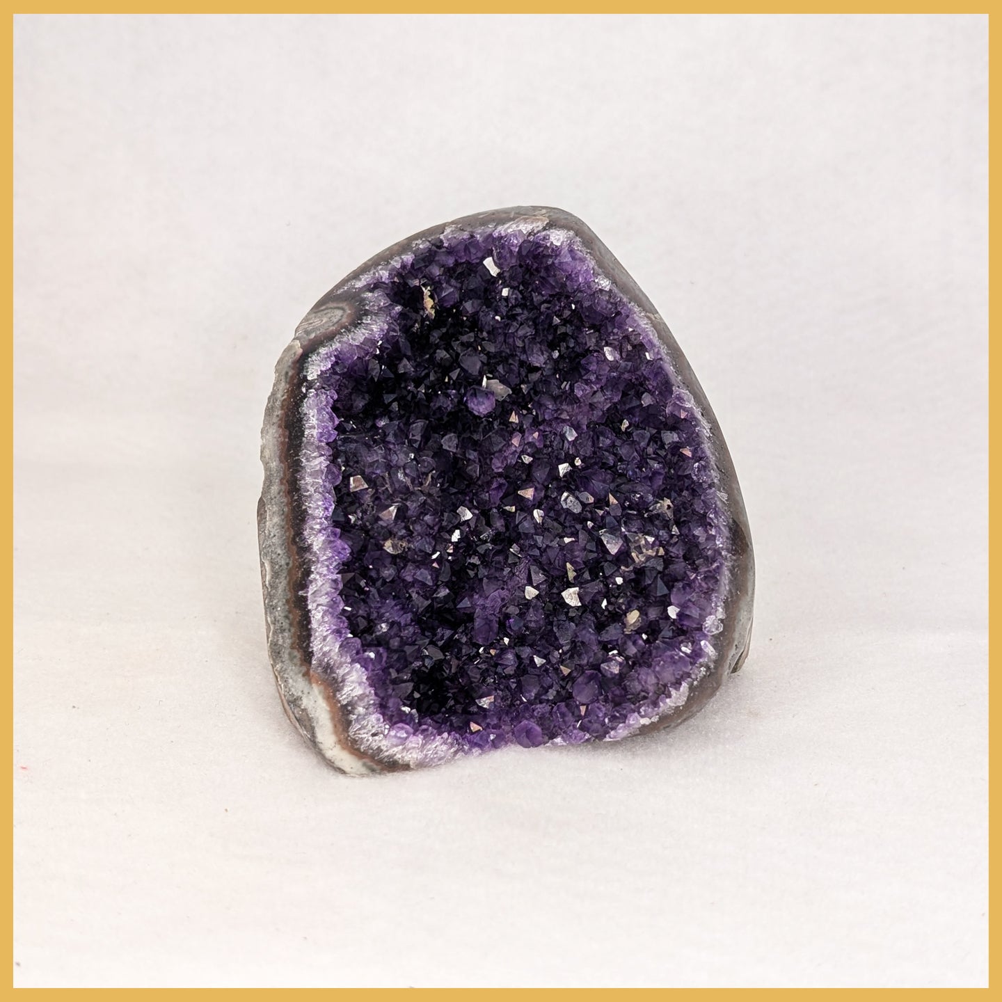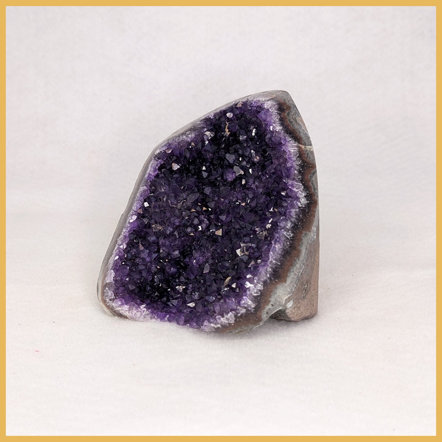 This Amethyst stand-up features deep purple Amethyst from Uruguay. It has polished edges, a flat cut bottom, and natural amethyst crystals.