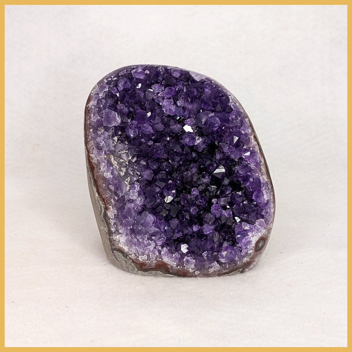 This Amethyst stand-up features deep purple Amethyst from Uruguay. It has polished edges, a flat cut bottom, and natural amethyst crystals.