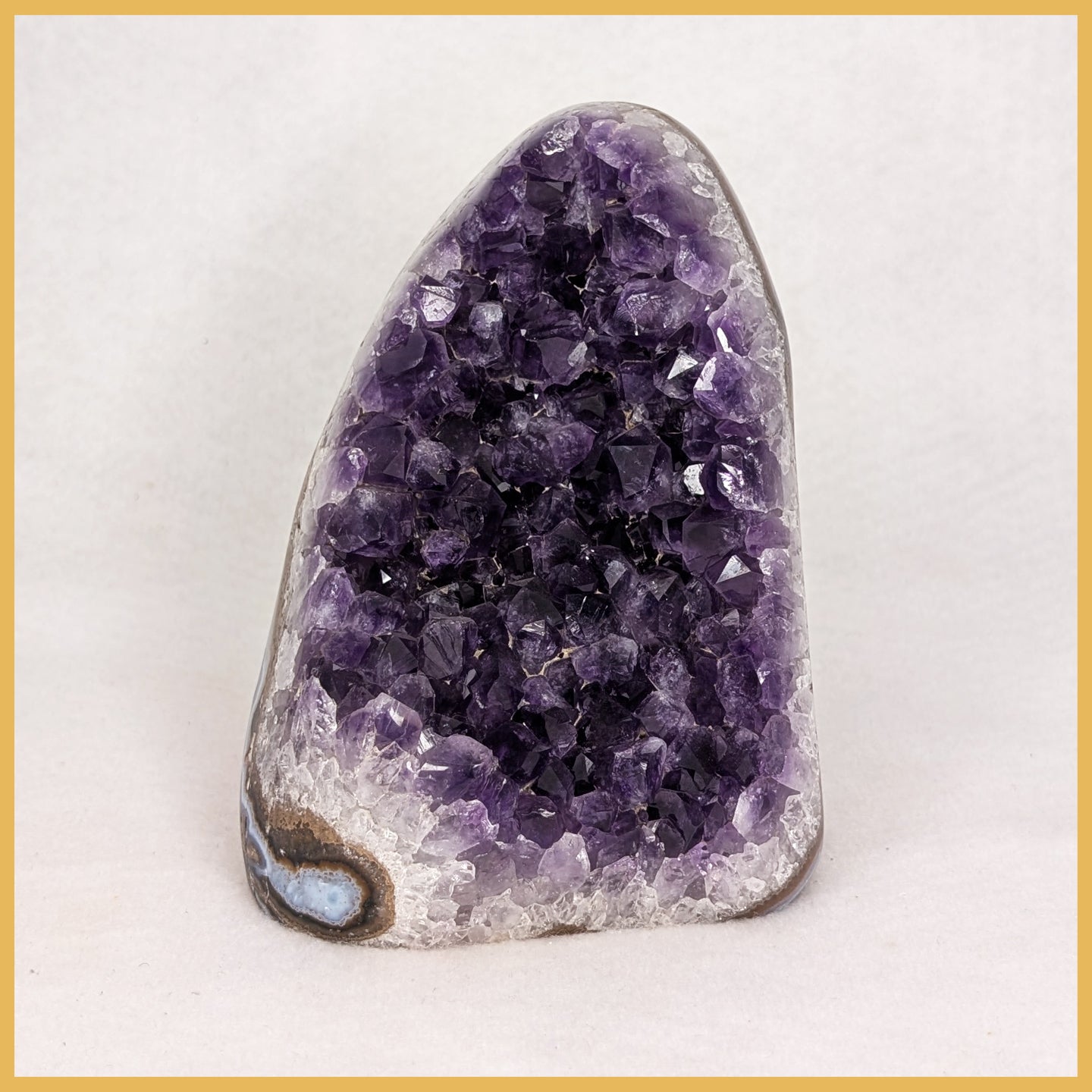 This Amethyst stand-up features deep purple Amethyst from Uruguay. It has polished edges, a flat cut bottom, and natural amethyst crystals.