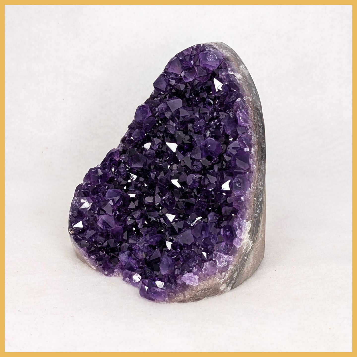 This Amethyst stand-up features deep purple Amethyst from Uruguay. It has polished edges, a flat cut bottom, and natural amethyst crystals.