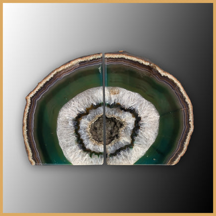 Made from a cut and polished Brazilian Agate nodule, this pair of bookends features alternating rings of quartz and banded agate in green hues (treated).