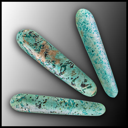 Polished wand made out of blue-green chrysocolla with speckles in darker or peach colors.