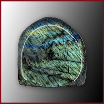This freeform Labradorite is from Madagascar, is fully polished, and has a flat base. Both the back and front faces feature strong labradorescence, primarily in blue, teal, and green, with hints of yellow and orange.
