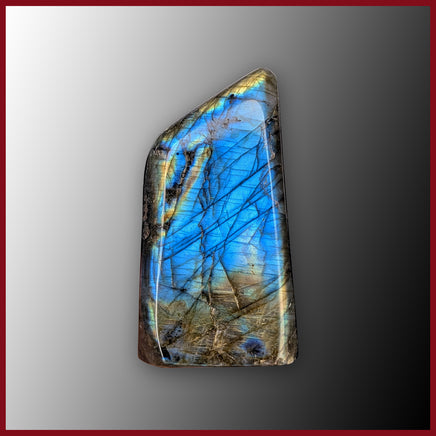 This freeform Labradorite is from Madagascar, is fully polished, and has a flat base. The face shows blue labradorescence with green, yellow, and orange, with a hint of purple. The back also has spots of strong color flash.