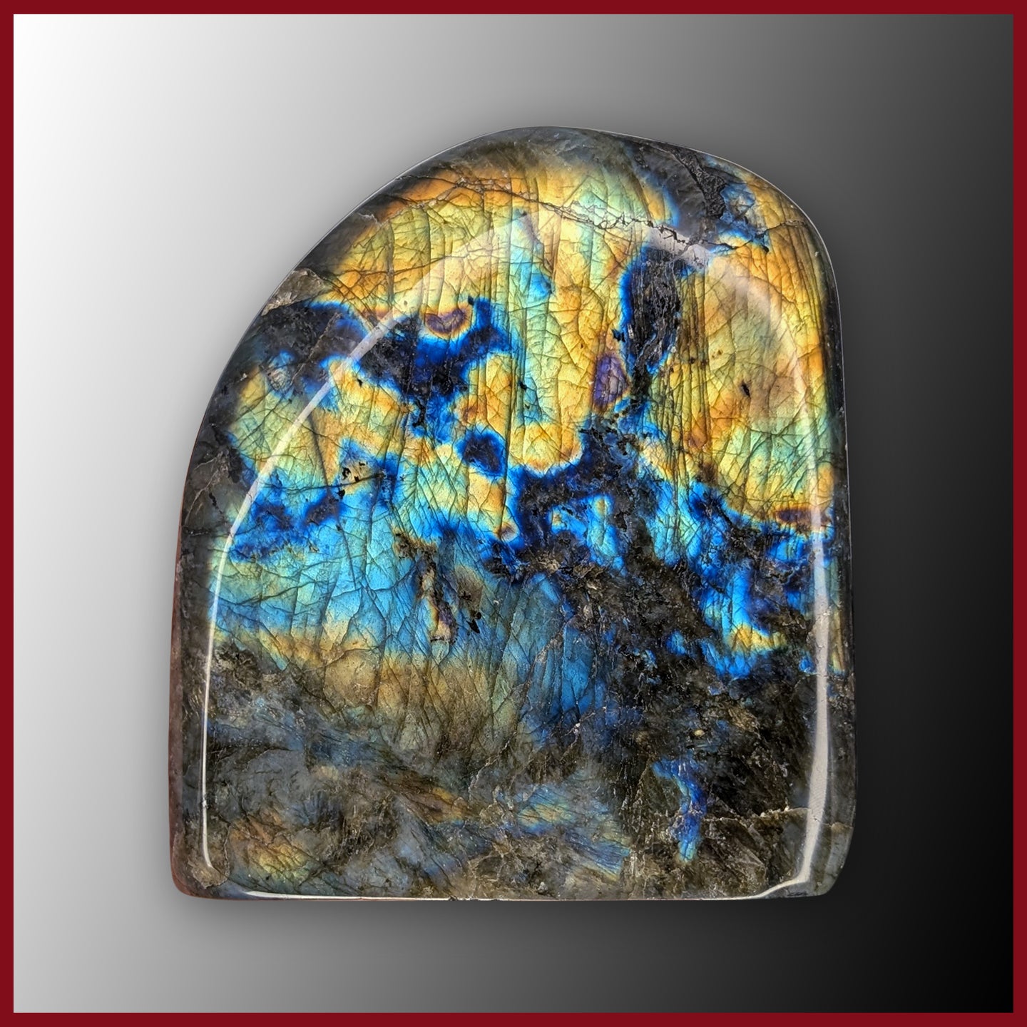 This large freeform Labradorite is from Madagascar, is fully polished, and has a flat base. The face shows strong labradorescence in orange, yellow, green, and blue, and the back includes a large section of strong purple.