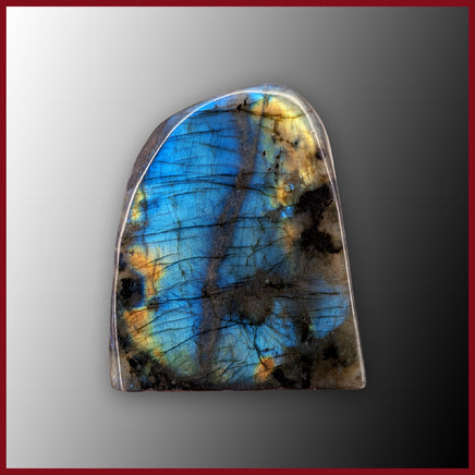 This freeform Labradorite is from Madagascar, is fully polished, and has a flat base. The face shows strong labradorescence in blues, with small sections of green, yellow, orange, and hints of purple.