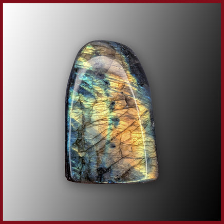 This freeform Labradorite is from Madagascar, is fully polished, and has a flat base. The face shows strong labradorescence in blue, green, yellow, and orange.
