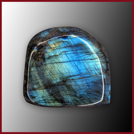 This freeform Labradorite is from Madagascar, is fully polished, and has a flat base. The face shows strong labradorescence in blues to yellow-greens.
