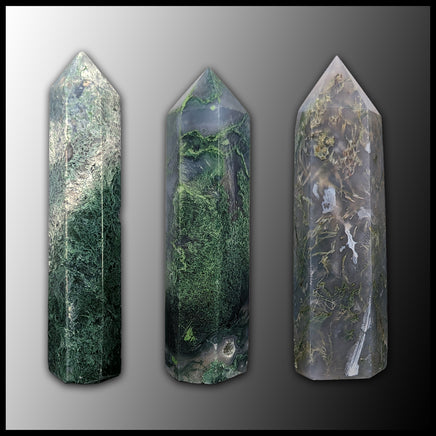 Price is for one moss agate tower. Pictures are representative of the product you will receive, but may not be the exact piece as each point is unique.