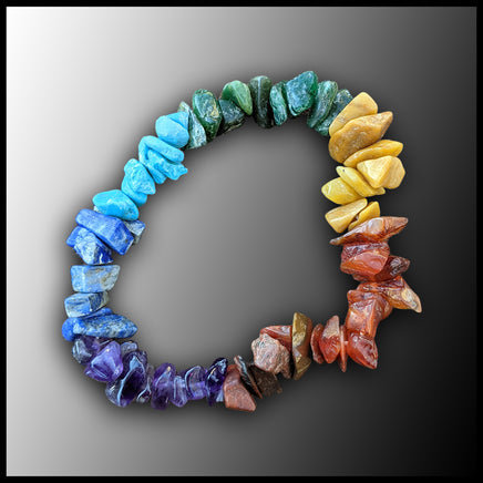 Chip bracelet featuring a rainbow of stone chips representing the seven chakras: Red Jasper (root chakra), Carnelian (sacral chakra), Yellow Aventurine (solar plexus chakra), Green Aventurine (heart chakra), Turquoise (throat chakra), Lapis Lazuli (third eye chakra), and Amethyst (crown chakra).