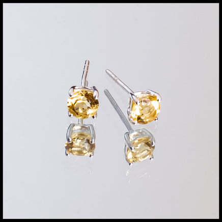 These silver stud earrings feature faceted yellow citrine in a prong setting.