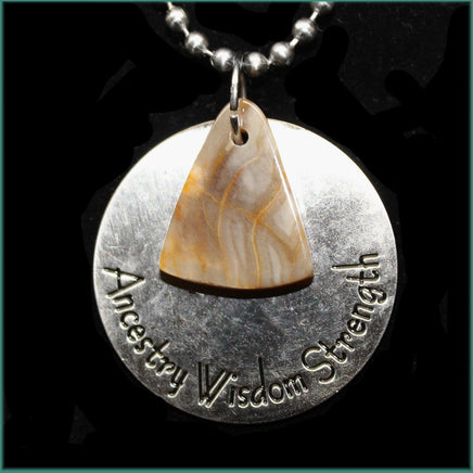 This pendant features a small drilled Petrified Wood bead and a stainless steel medallion featuring the words, "Ancestry, Wisdom, Strength." Hangs on a 20" stainless ball chain.