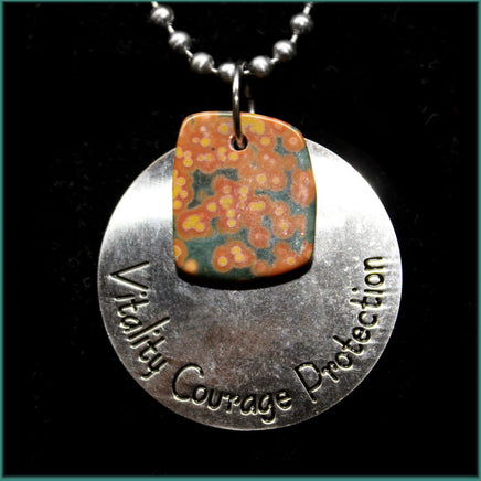 This pendant features a small drilled Ocean Jasper bead and a stainless steel medallion featuring the words, "Vitality, Courage, Protection." Hangs on a 20" stainless ball chain.
