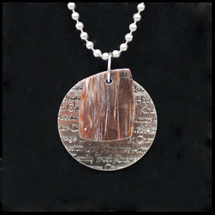 This pendant features a small drilled Petrified Wood bead and a stainless steel medallion featuring the words, "Humor, Family, Trust, Honor, Courage, Love, Hope, Charity, Passion, Joy, Kindness, Truth." Hangs on a 18" stainless ball chain.