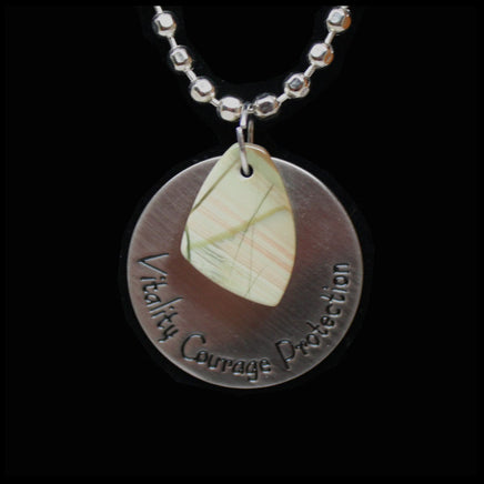 This pendant features a 23 mm x 19 mm drilled Rocky Butte Picture Jasper bead and a stainless steel medallion featuring the words, "Vitality, Courage, Protection." Hangs on a 18" stainless ball chain.