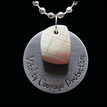 This pendant features a 23 mm x 17 mm drilled Imperial Jasper bead and a stainless steel medallion featuring the words, "Vitality, Courage, Protection." Hangs on a 18" stainless ball chain.