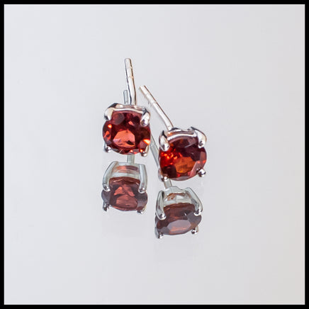 These silver stud earrings feature faceted red garnet in a prong setting.