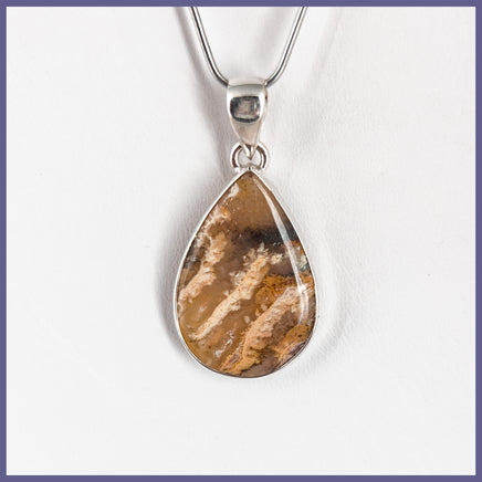 This pendant features a polished cabochon of Graveyard Point Plume Agate from the TGS Beverly Marie claim in Oregon. The piece features translucent and creamy yellow agate, and is set in 925 sterling silver.